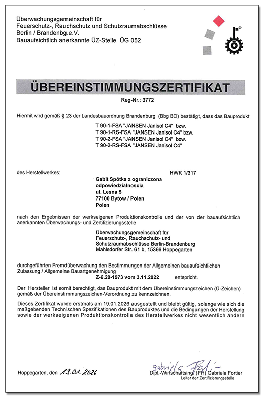 System Jansen Janisol C4 EI90 to stalowy system profili do drzwi i przeszkleń ogniowych o klasie odporności EI90, zaprojektowany z myślą o maksymalnej ochronie przeciwpożarowej, kontroli dymu oraz bezpieczeństwie użytkowym. System pozwala na wykonanie jednoskrzydłowych i dwuskrzydłowych drzwi oraz ścian ogniowych z przystosowaniem do elementów bocznych i nadświetli, zarówno z ruchomymi skrzydłami, jak i stałymi panelami szklonymi.